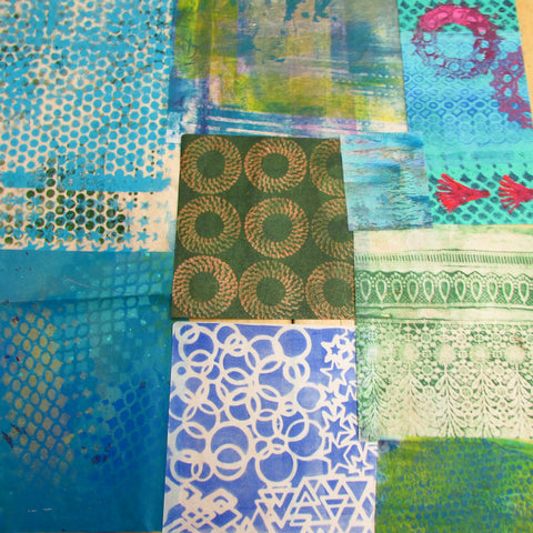 They are mostly handmade monotype prints made with a Gelli plate although some are hand painted. The paints are mainly acrylic although there may have been some printing ink and cyanotype. Some have lustres from metallic and iridescent paints. Most have layers of colour and designs vary including: abstracts, geometrics, textures and botanical.