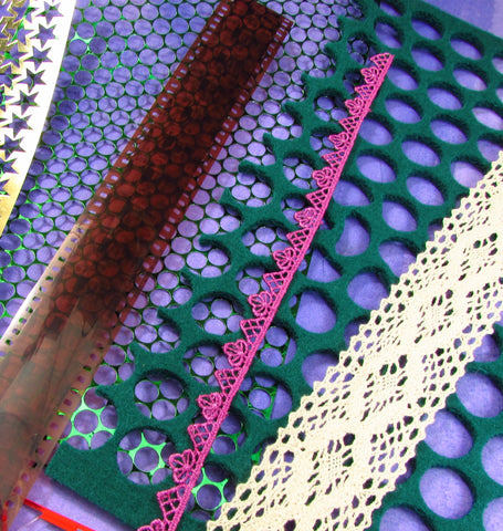 You will receive 1 x extra wide circle punchinella, 1 x stars punchinella, 1 x hexagon punchinella, 1 x film strip, 1 x felt mat and 1 x lace, 1 x braid