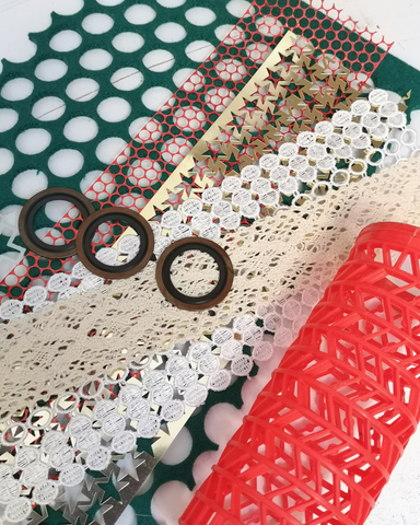 Collage of various craft supplies including a brayer, stamps, and paint on a white background.